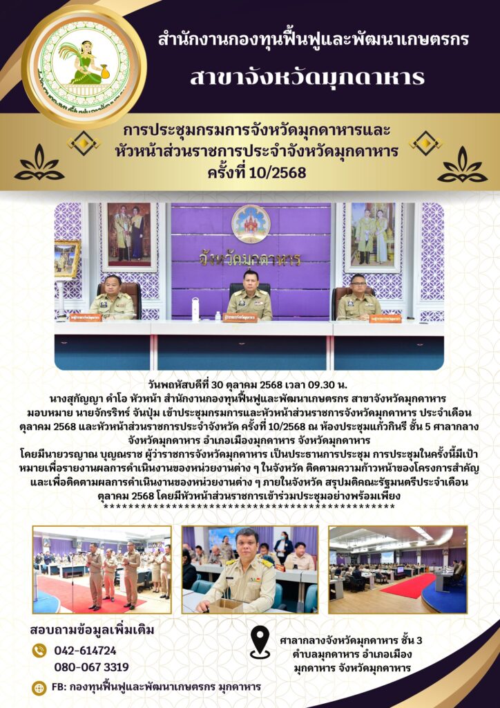 โดยมีนายวรญาณ บุญณราช ผู้ว่าราชการจังหวัดมุกดาหาร เป็นประธานการประชุม การประชุมในครั้งนี้มีเป้าหมายเพื่อรายงานผลการดำเนินงานของหน่วยงานต่าง ๆ ในจังหวัด ติดตามความก้าวหน้าของโครงการสำคัญ และเพื่อติดตามผลการดำเนินงานของหน่วยงานต่าง ๆ ภายในจังหวัด สรุปคณะรัฐมนตรีประจำเดือนตุลาคม 2568 โดยมีหัวหน้าส่วนราชการเข้าร่วมประชุมอย่างพร้อมเพียง